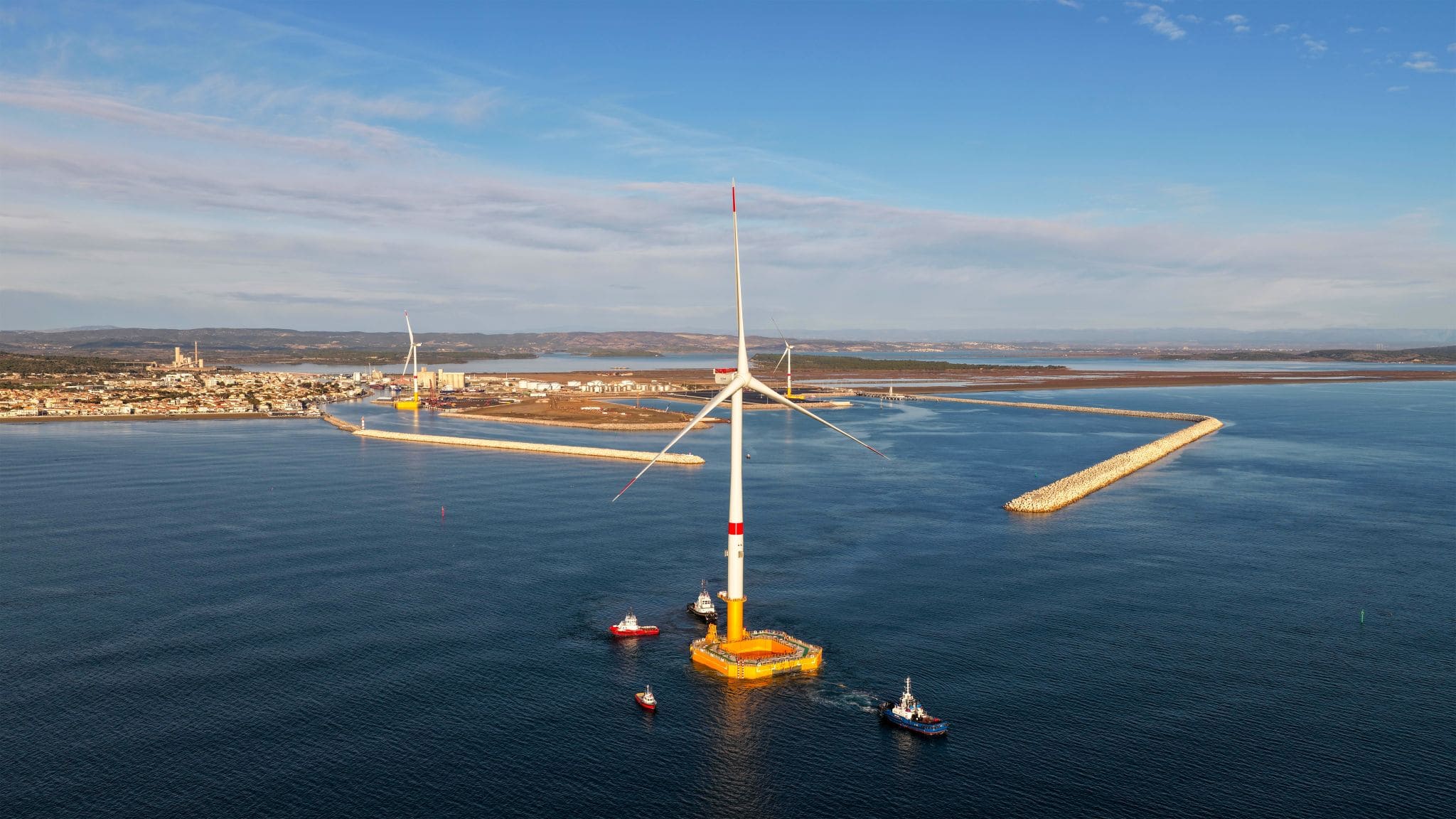 Une fois la troisième éolienne transportée, l’étape suivante consistera donc à procéder au montage final en mer des trois turbines flottantes. Des opérations de fixation, de câblage et de mise en service électrique doivent encore être effectuées avant que la connexion au réseau terrestre, assurée par Réseau de Transport d’Électricité (RTE) grâce à un câble sous-marin et souterrain jusqu’à la station électrique côtière, puisse se faire.