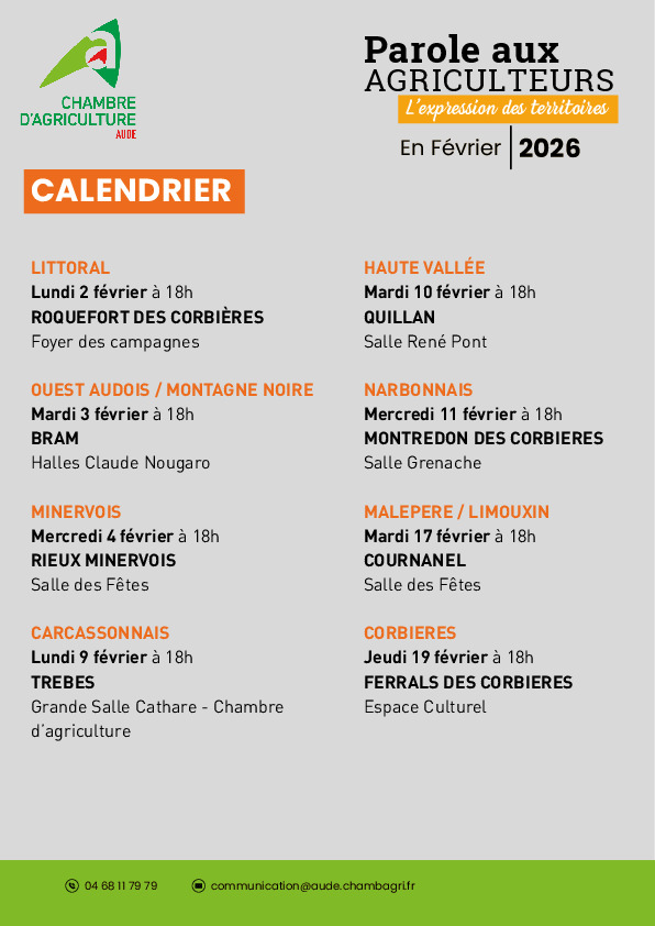 Organisées à travers tout le département de l’Aude, ces réunions s’adressent à tous les professionnels agricoles, quel que soit leur secteur. Elles représentent un moment important de la vie agricole locale. Les agriculteurs pourront dialoguer directement avec les équipes de la Chambre, se renseigner sur les actualités du secteur et faire remonter leurs préoccupations.