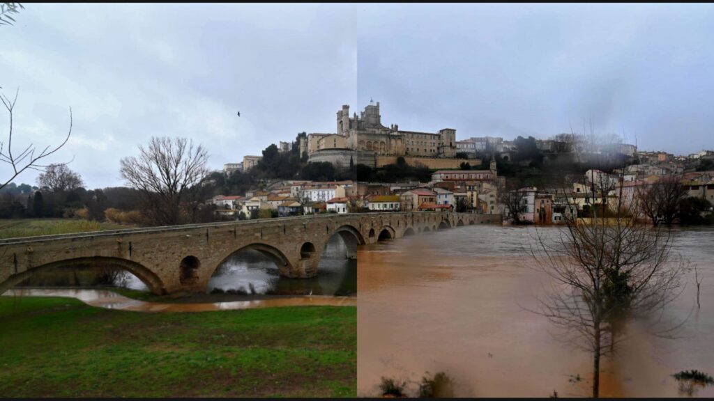 - Dans l’Hérault, au niveau du Pont-Vieux à Béziers, l’Orb a dépassé à 14h20 la côte de 11,2m (c’est à dire autant que lors de la crue du 16 octobre 2018). La hauteur d’eau est de 11,35m à 16h et un débit de 835,00 m³/s, toujours en montée.