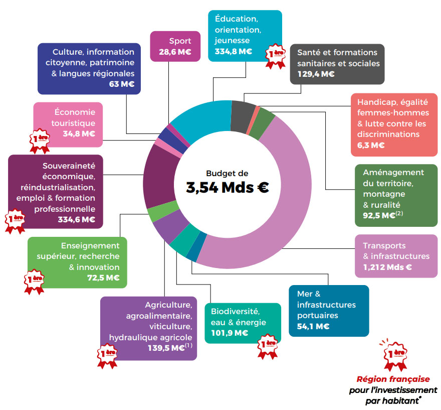 Une enveloppe similaire est consacrée à l’emploi et à la formation professionnelle, avec près de 335 millions d’euros pour accompagner des milliers de demandeurs d’emploi et soutenir les entreprises du territoire. L’agriculture (139 millions d’euros) et la santé (129 millions d’euros, principalement pour contrer les déserts médicaux) figurent également parmi les priorités budgétaires.