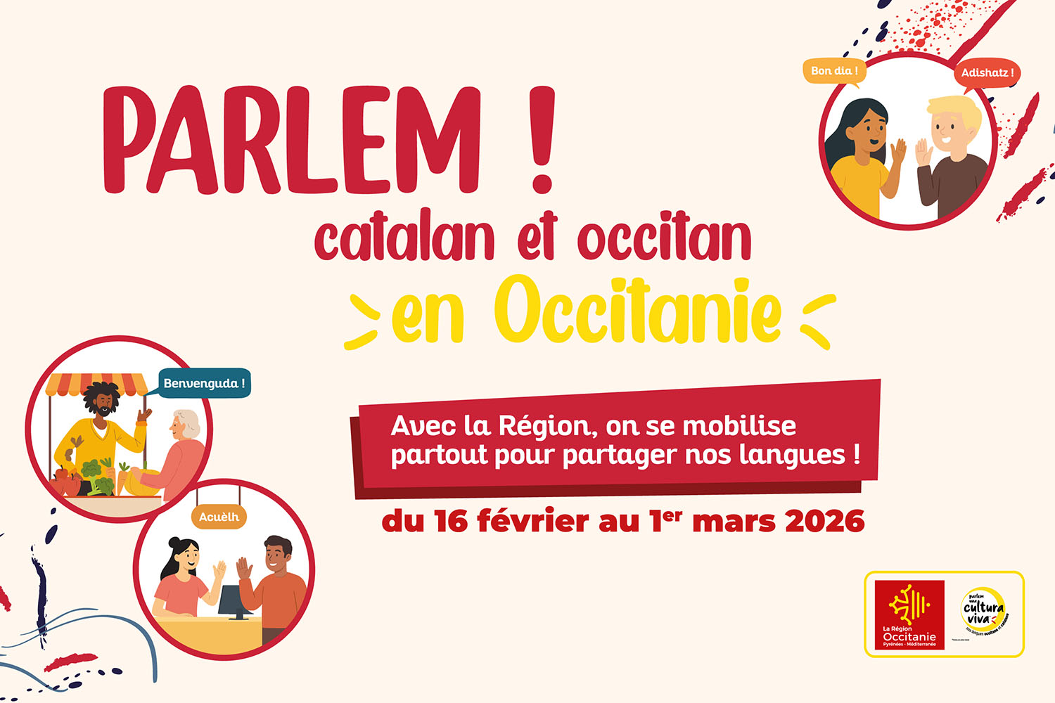 À partir du 16 février et jusqu’au 1ᵉʳ mars 2026, la Région Occitanie déploie, sur tout son territoire, l’événement PARLEM ! Catalan et Occitan, une célébration participative des langues régionales : l’occitan et le catalan.